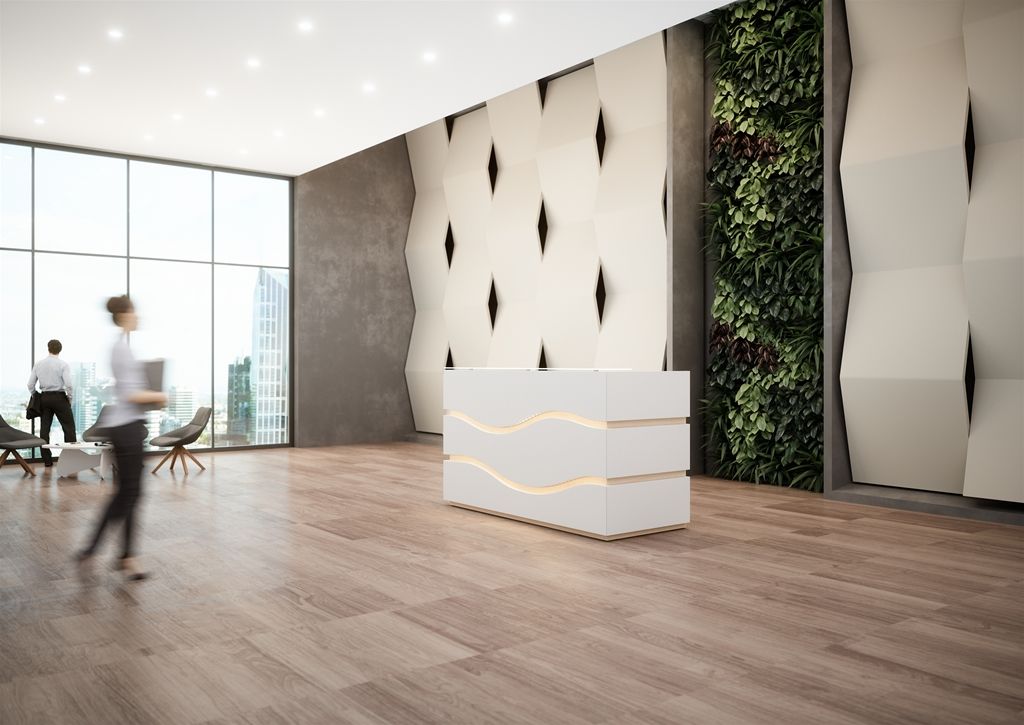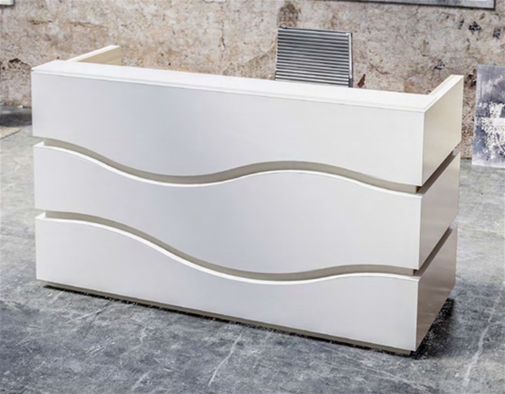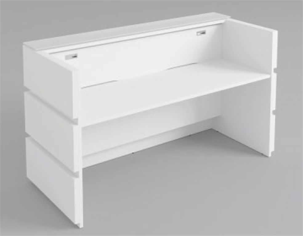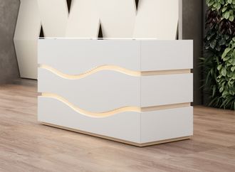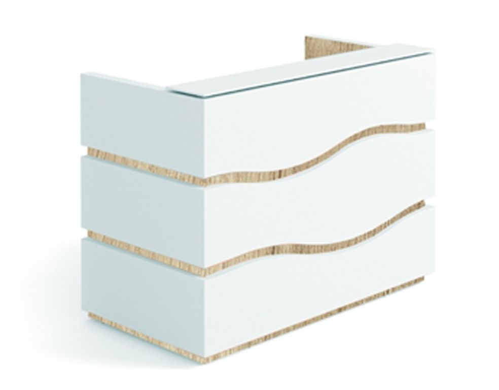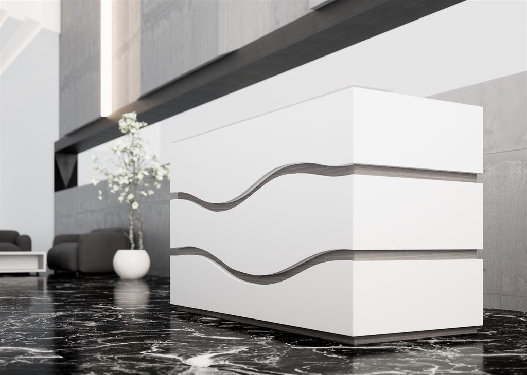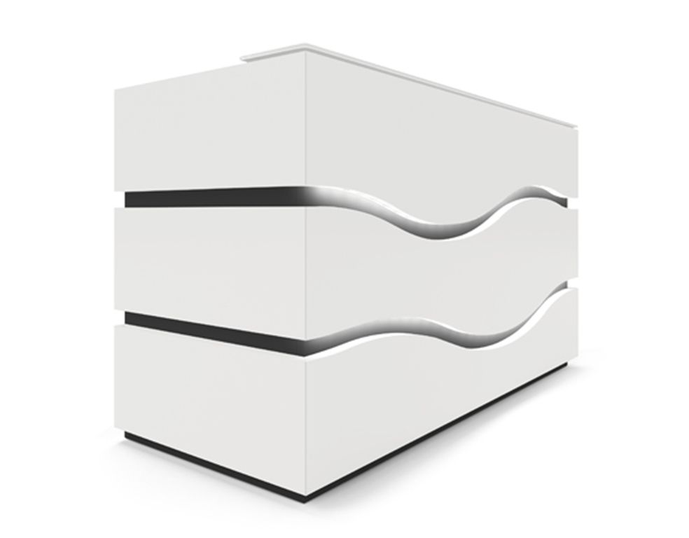 Стильная и лаконичная стойка ресепшн, расширяющая пространство и создающая эффект легкости. Может быть выполнена из ЛДСП, крашеного или шпонированного МДФ, декоративного пластика, искусственного камня. Цена за погонный метр может изменяться в зависимости от выбранного материала