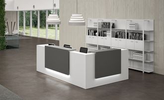 Стильная, современная и лаконичная стойка ресепшн. Возможны различные модификации. Может быть выполнена из ЛДСП, крашеного МДФ или искусственного камня. Стоимость за погонный метр может изменяться в зависимости от выбранных материалов.