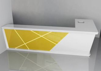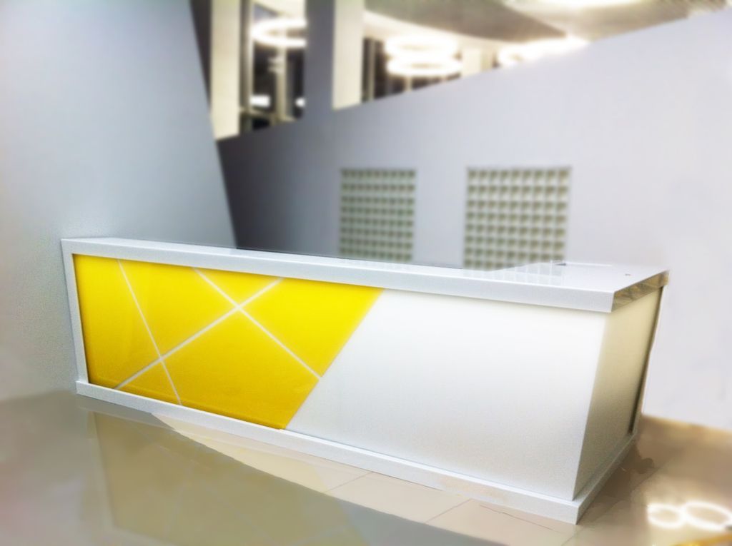 Стильная и эффектная стойка выполнена из крашеного МДФ, декоративного пластика, искусственного камня. Может быть выполнена из ЛДСП, МДФ, алюмокомпозита, и других материалов. Стоимость за погонный метр может меняться в зависимости от выбранных материалов.