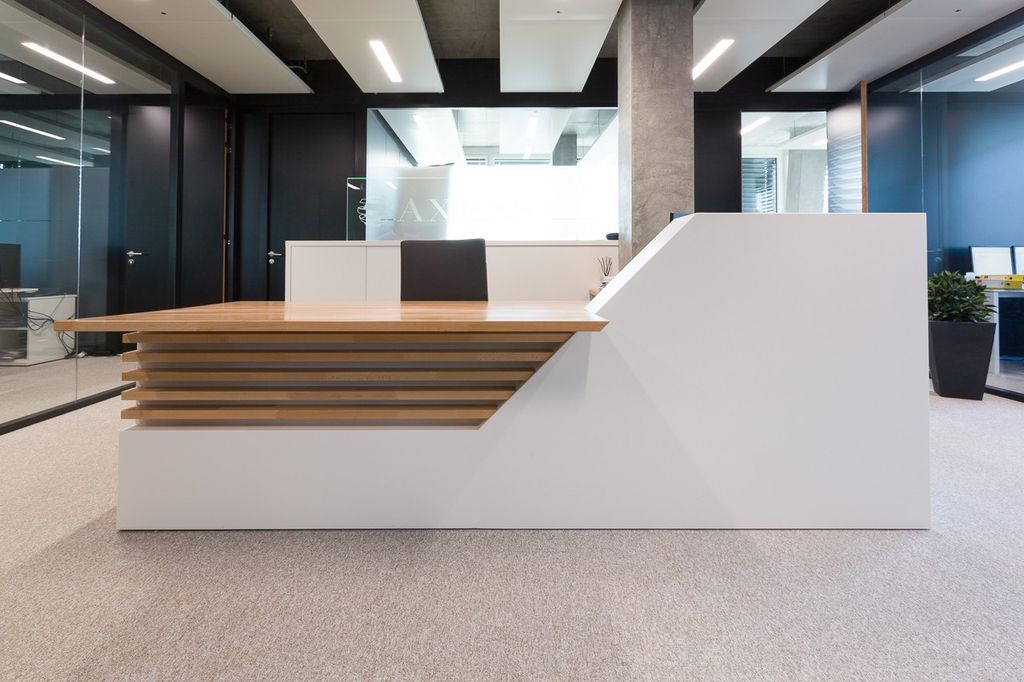 Эффектная стойка ресепшн привлекает внимание интересным сочетанием геометрии форм и стилей. Разноуровневые модули создают комфортные условия взаимодействия клиента и администратора. Может быть выполнена из ЛДСП, МДФ, искусственного камня, массива. Может быть выполнена также из МДФ, алюмокомпозита,шпона и других материалов. Стоимость за погонный метр может меняться в зависимости от выбранных материалов.
