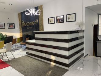 Элегантная стойка ресепшен придает яркость и эстетичность пространству, создавая легкую, оживленную атмосферу. Стойка может быть выполнена из глубокоглянцевых МДФ панелей UV-лак, ЛДСП Kronospan, декоративного пластика, стекла. Может быть выполнена также из МДФ, алюмокомпозита, и других материалов. Стоимость за погонный метр может меняться в зависимости от выбранных материалов.